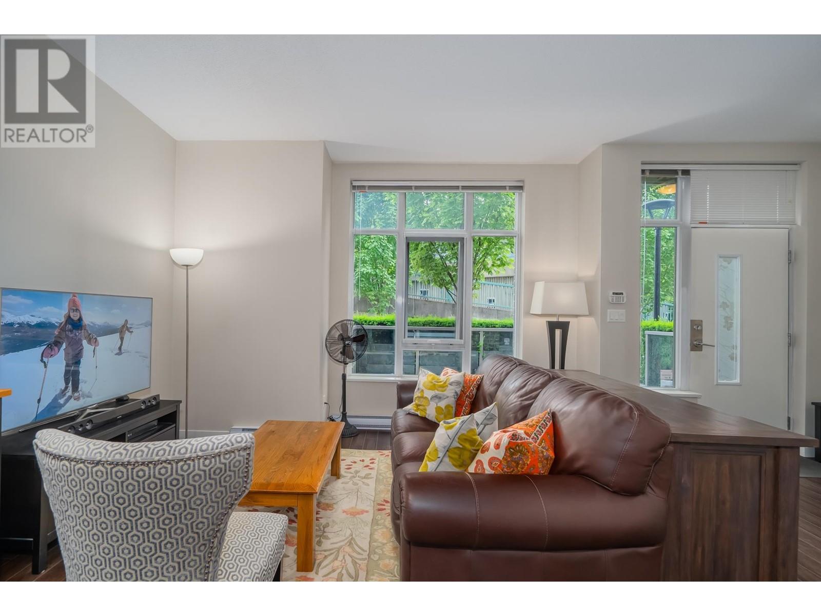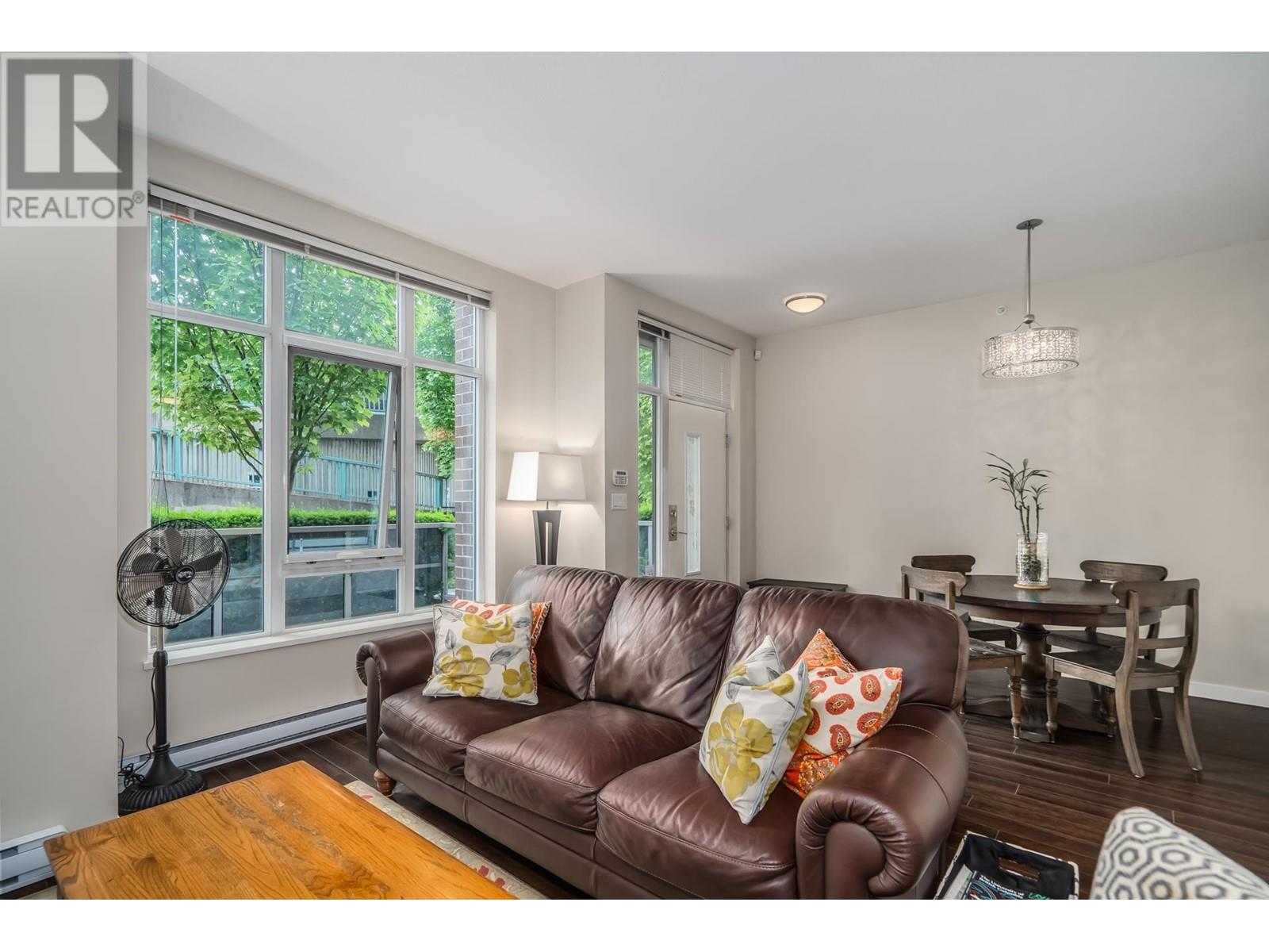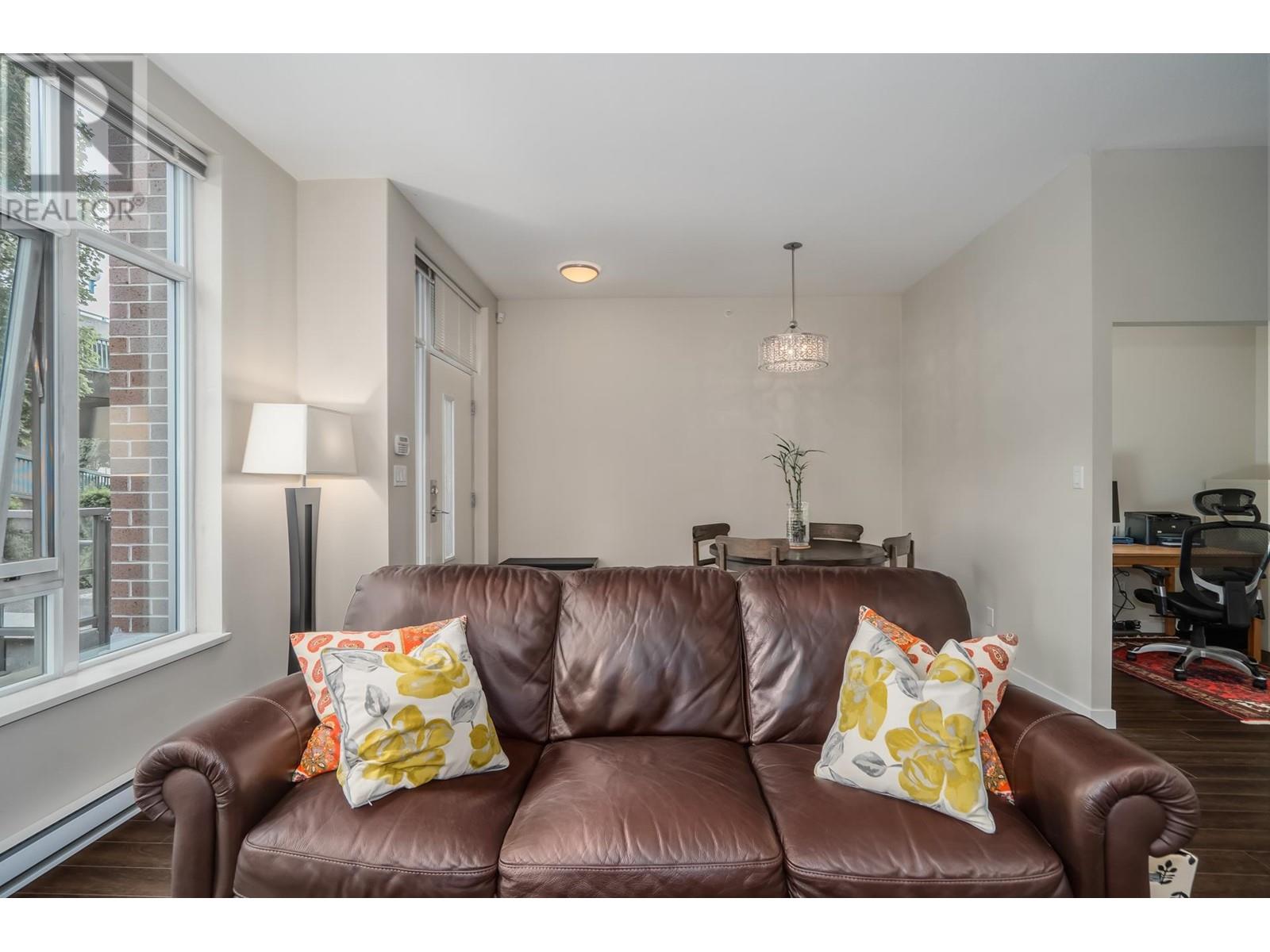 Welcome to Maynards Block in Olympic Village! This W-facing, 2 level, townhome is 1411 sf of open concept living featuring 2 bedrooms, 2.5 baths, 2 good size dens and a 136 sf private patio great for BBQs and entertaining family & friends. The main floor has high ceilings, wide plank laminate floors, recessed pot lighting and a gourmet kitchen featuring modern European cabinetry with soft close dr