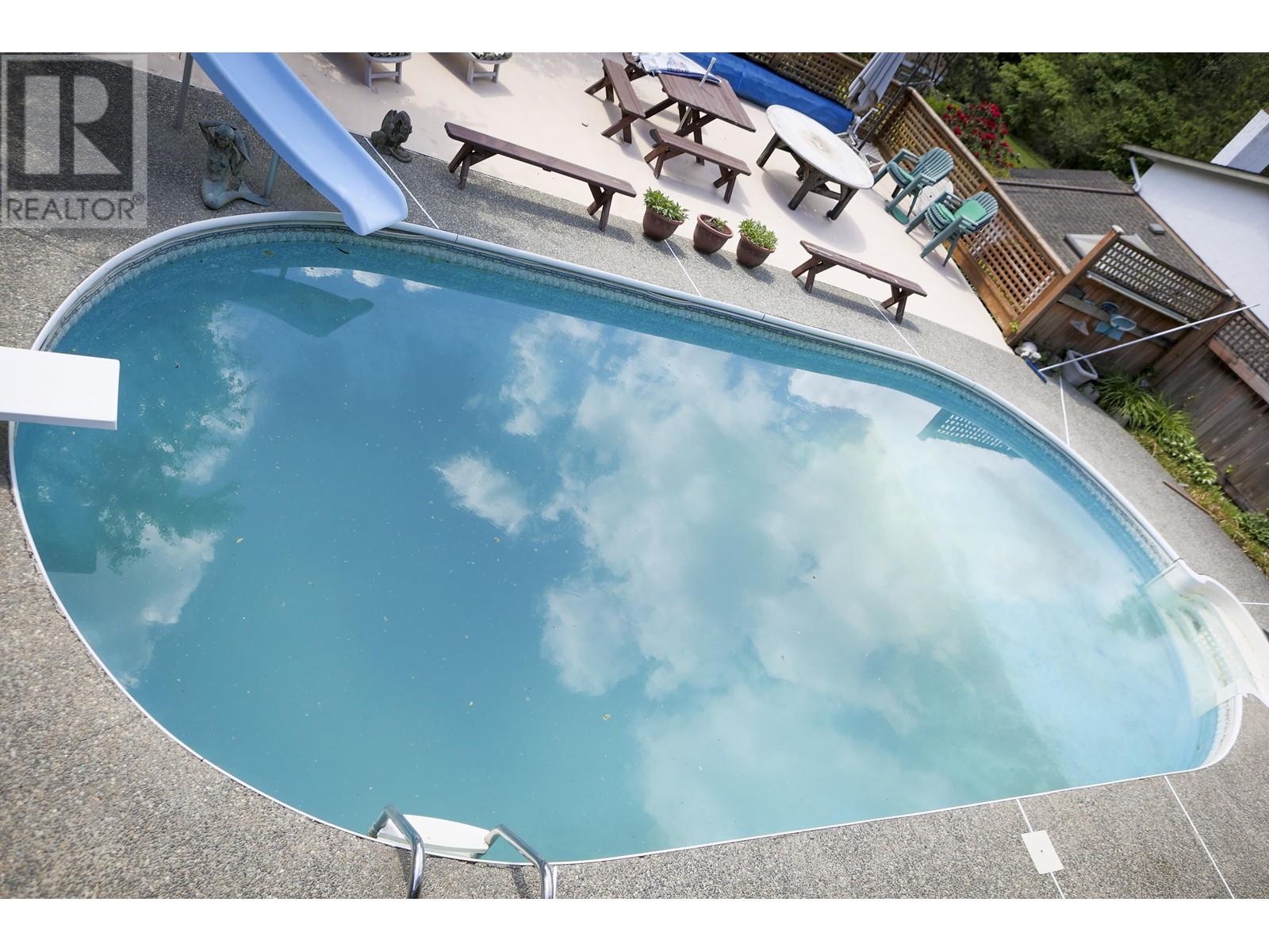 This four-bedroom bather's paradise on Port Moody's beautiful north shore has everything you need for the backyard relaxation of your dreams: an ample pool with diving board, slide, and a massive pool deck for sunbathing, parties, or family dinners, complete with a hot tub, dry sauna, outdoor shower, and even a full bathroom and kitchen accessible just inside the ground-level suite. Do your rainy-