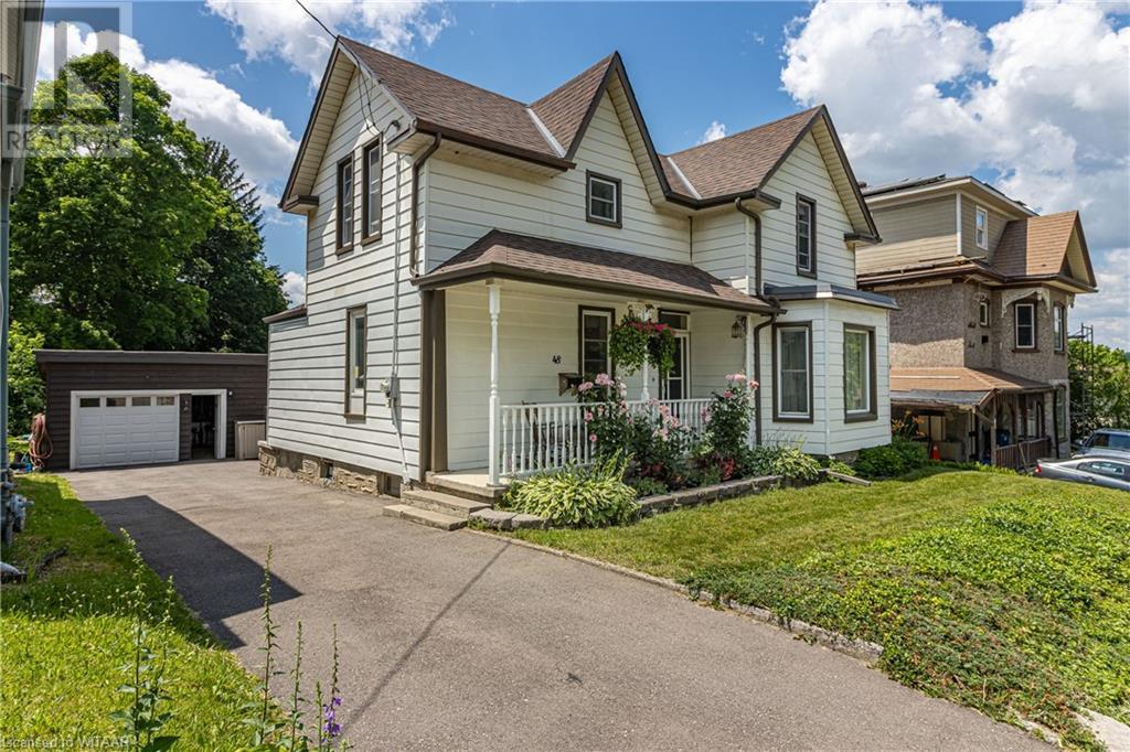 Welcome to 48 Harvey Street in desirable Hespeler. Sitting on a deep lot, this home offers something for every buyer – three bedrooms with walk in closets, a double garage for parking and hobbies, and a heated swimming pool! Walking from the covered porch and through the front door with classic transom window, be drawn into the charming comfort of the foyer with a beautiful wooden staircase. To