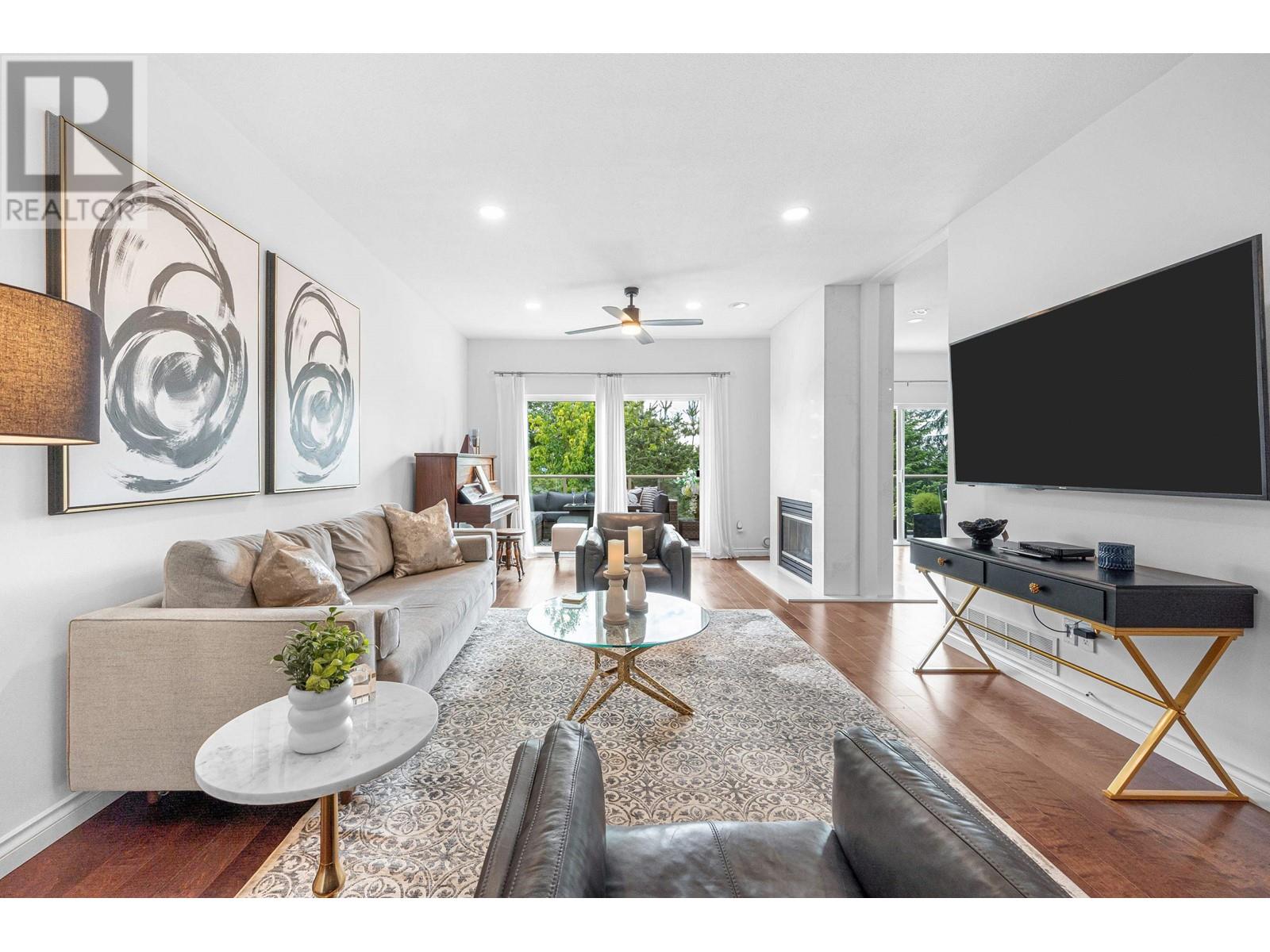 Bright and beautiful, this fully renovated executive townhome in the highly sought after Deercrest Estates, features 3 bedrooms, 4 bathrooms and a den/home office on the main. Recently updated, this luxurious home boasts a stunning kitchen with a waterfall quartz counter, beautiful cabinetry, and a top-of-the-line, side-by-side fridge and freezer. A double-sided gas fireplace with a dramatic quar