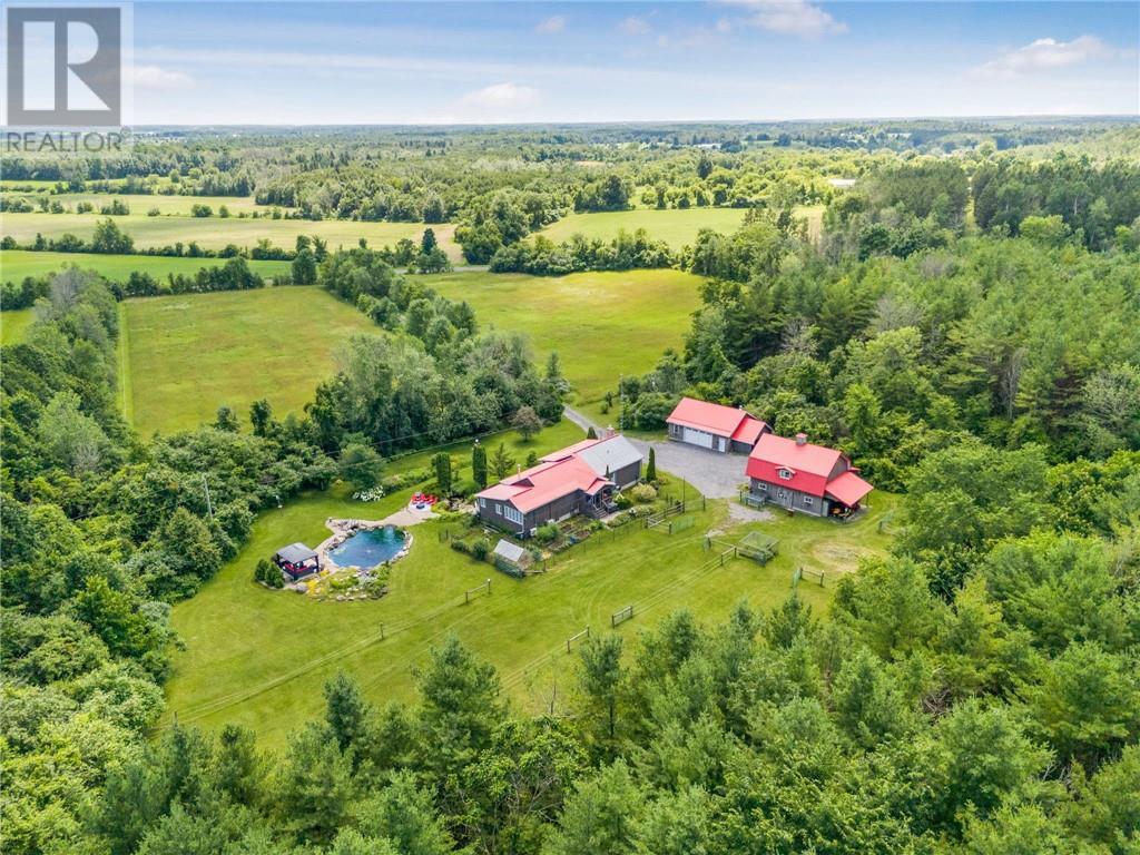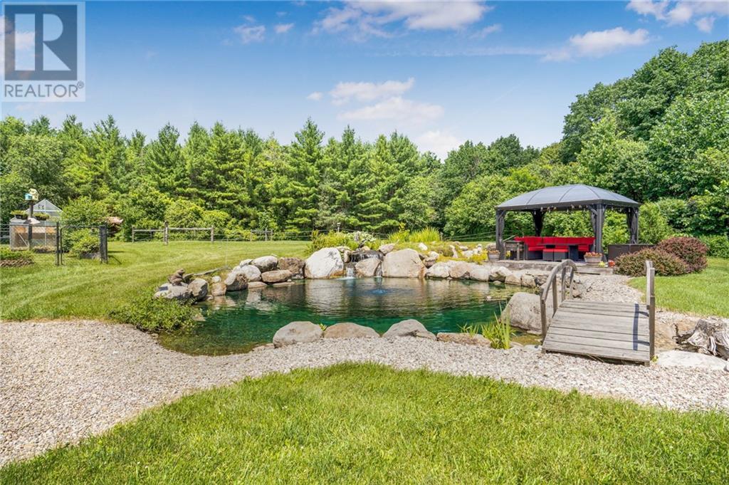 A TRUE HIDDEN 50 ACRES HOBBY EQUESTRIAN FARM! A long laneway leads you to a very private secluded setting nestled amongst mature trees on a hilltop w/a south facing view, where peace & quiets awaits you! Your family will enjoy this beautiful home in pristine condition, fully upgraded surrounded by mature perennial flower beds, gardens, stunning fish pond with waterfall and one natural swimming pon